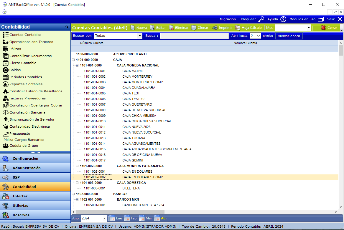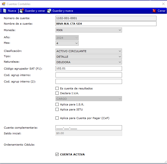 Capture el Catálogo de Cuentas que aplicará para su empresa, esto de acuerdo con la máscara de cuentas definida en Niveles.