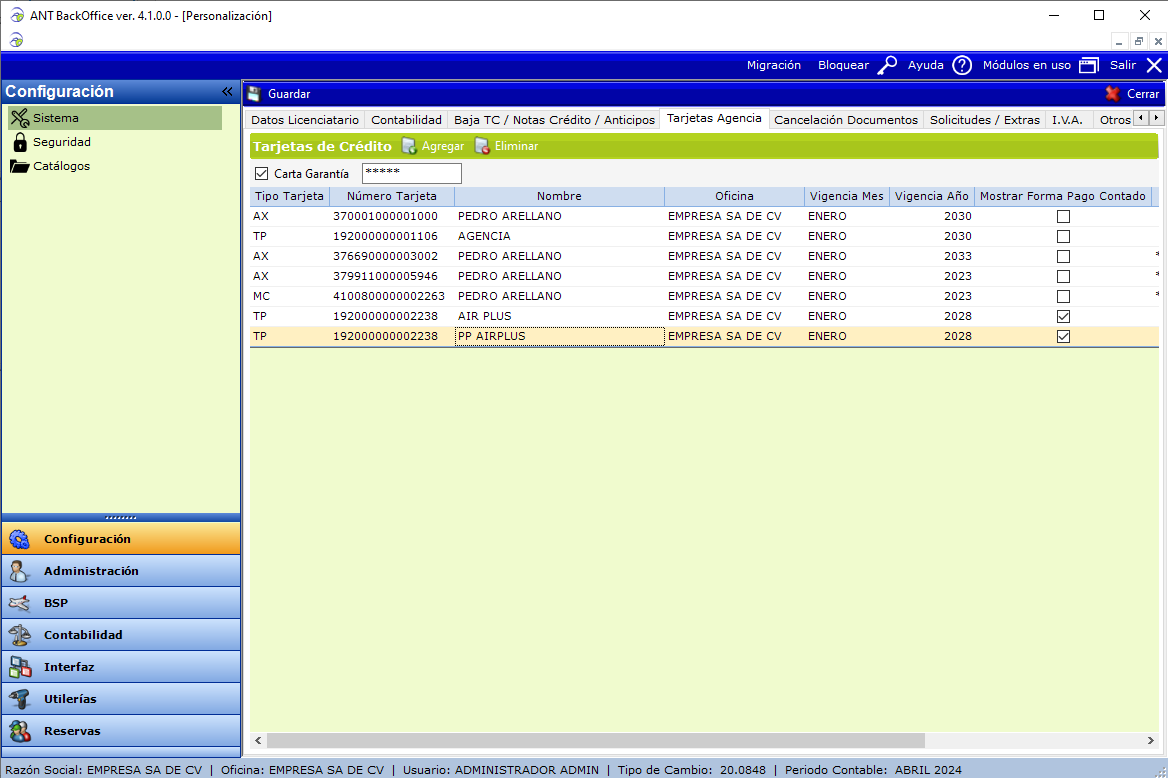 CONFIGURACIÓN - SISTEMA - PERSONALIZACIÓN - CONTABILIDAD - TARJETAS AGENCIA