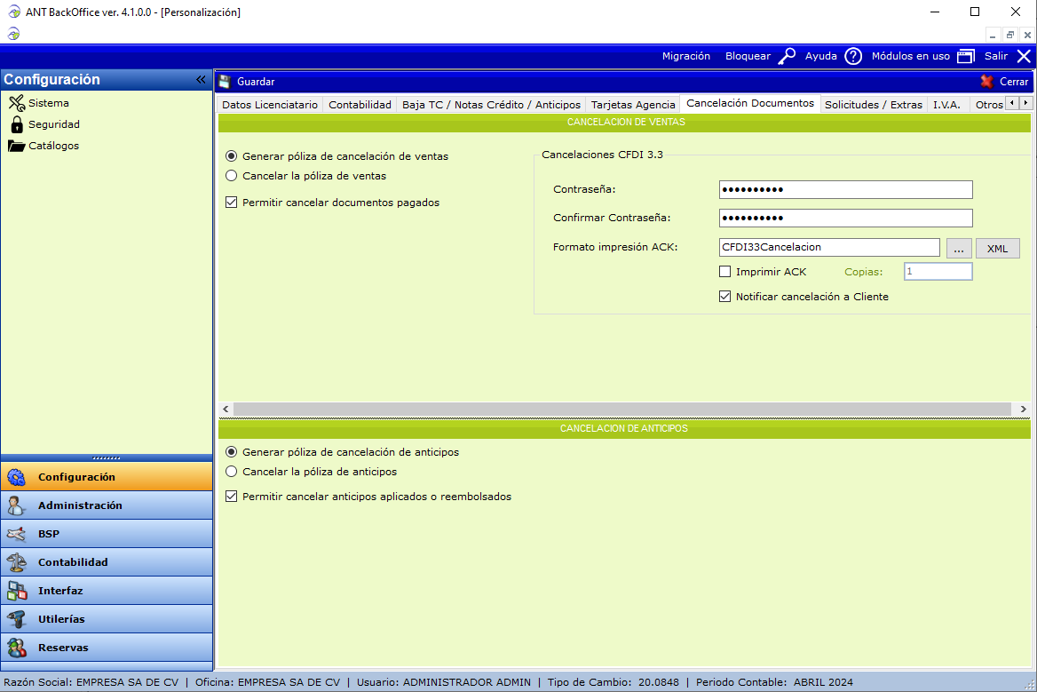 Configurar si la cancelación es con póliza que Genera el sistema dando reversa a los movimientos contables. Configurar la contraseña para cancelar los documentos fiscales.