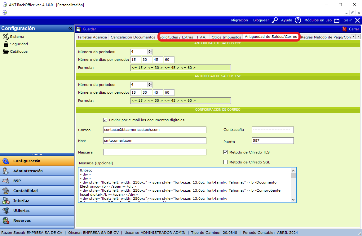Antiguedad de saldos/Correo .- Periodos en la consulta de Cuentas por Cobrar y Cuentas por Pagar. Configurar correo electronico para envio de documentos digitales