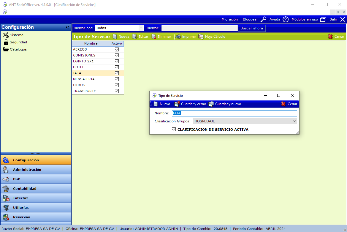 CONFIGURACIÓN - CATÁLOGOS - SERVICIOS - CLASIFICACIÓN DE SERVICIOS