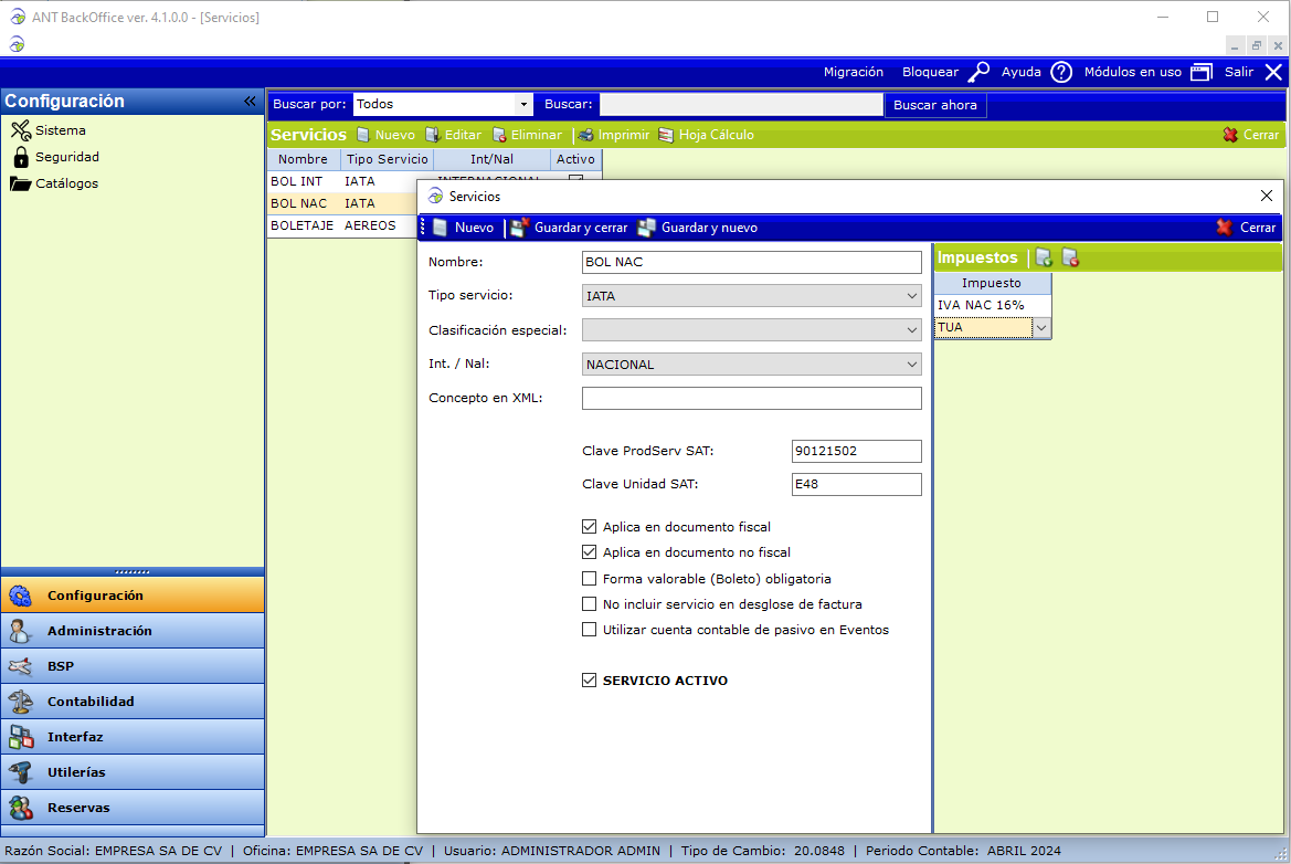 Registre los Servicios, indicando que Tipo son de acuerdo al Catálogo anterior y asignando los Impuestos que aplicará.